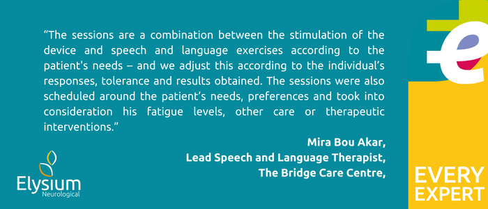 “So the sessions are a combination between the stimulation of the device and speech and language exercises according to the patient’s needs – and we adjust this according to the individual’s responses, tolerance and results obtained. The sessions were also scheduled around the patient’s needs, preferences, any visits/outings that he had planned and took into consideration his fatigue levels, other care or therapeutic interventions and the best times for optimal engagement.