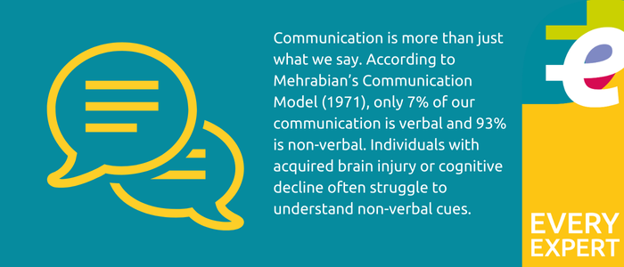 Communication is more than just what we say. According to Mehrabian’s Communication Model (1971), only 7% of our communication is verbal and 93% is non-verbal. Most of our predictions and inferences used within communication are based on a person’s non-verbal behaviour, using body language, facial expressions or tone of voice. Individuals with acquired brain injury or cognitive decline often struggle to understand non-verbal cues which can result in socially inappropriate behaviour and make living within the community a challenge.