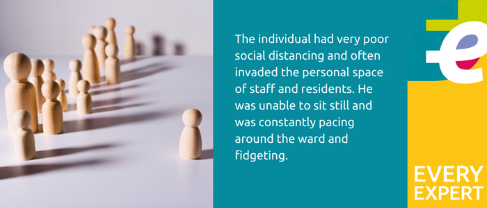 “However during the first CPA meeting, the wider TDT reflected on the severity of the socially inappropriate behaviours that ER was displaying. For example, he had very poor social distancing and often invaded the personal space of staff and patients. He was unable to sit still and was constantly pacing around the ward and fidgeting. Due to the nature of the inappropriate comments directed towards female members of staff all interactions were 2-1 for safety reasons.