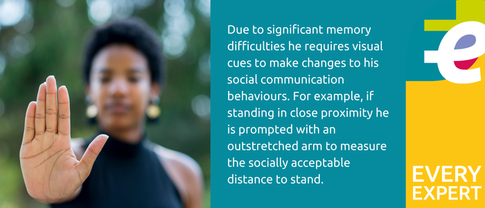 “Due to significant memory difficulties ER requires visual cues to make changes to his social communication behaviours. For example, if standing in close proximity he is prompted with an outstretched arm to measure the socially acceptable distance to stand. If he uses exaggerated greetings he is prompted by pointing discretely to your hand to reduce the scale of his gesture.
