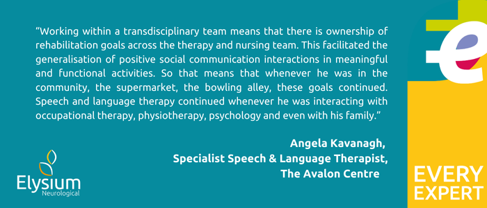“Working within a transdisciplinary team means that there is ownership of rehabilitation goals across the therapy and nursing team. For example, ER had four main goals for his speech and language rehabilitation programme but these were also practised in other settings and were added to his Community Access Programme. This facilitated the generalisation of positive social communication interactions in meaningful and functional activities. So that means that whenever ER was in the community, in the supermarket doing his shopping, in the bowling alley, these goals continued. Speech and language therapy continued whenever he was interacting with occupational therapy, physiotherapy, psychology and even with his family.”