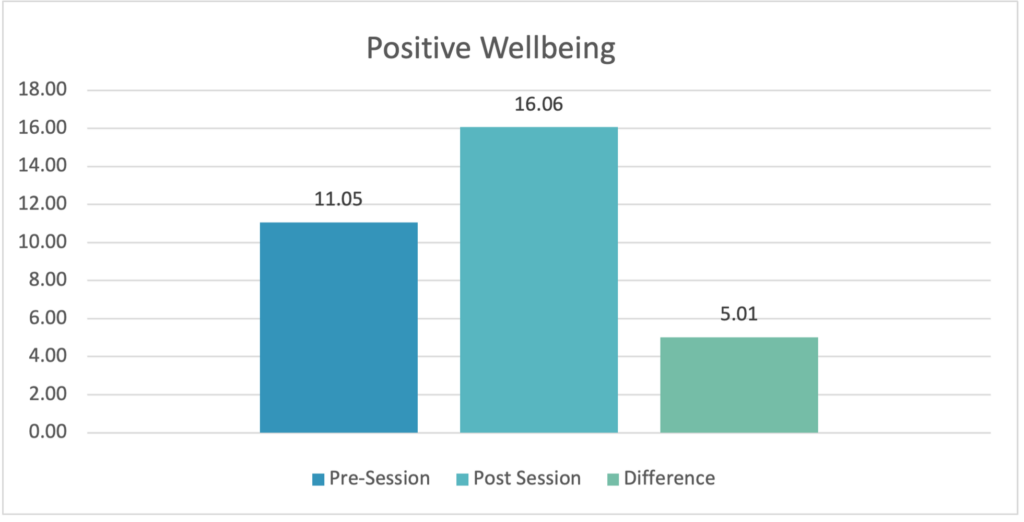 On the positive wellbeing subscale, the cohort had a mean pre-session score of 11.05, and a mean post-session score of 16.06, representing a 5.01 increase in positive wellbeing.