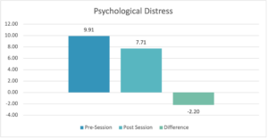 For the psychological distress subscale, the cohort had a mean pre-session score of 9.91 and a mean post-session score of 7.71, representing a 2.20 decrease in psychological distress.