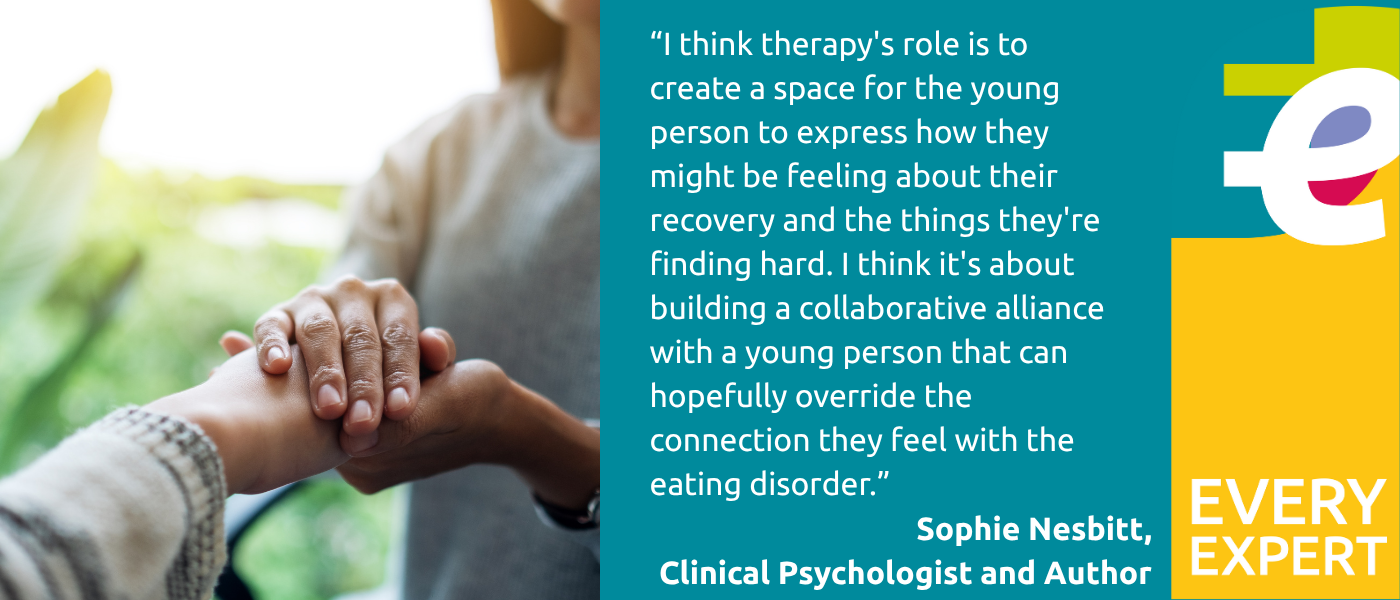 “I think therapy’s role is to create a space for the young person to express how they might be feeling about their recovery and the things they’re finding hard. I think it’s about building a collaborative alliance with a young person that can hopefully override the connection they feel with the eating disorder. It’s about presenting an alternative perspective to how they are thinking about things, and to voice an alternative way of being. I also think it’s about engagement in a safe place, being a safe person and understanding even when it doesn’t make sense and for that to be OK in the therapy room. The role of therapy is to have a supportive, compassionate focus.”