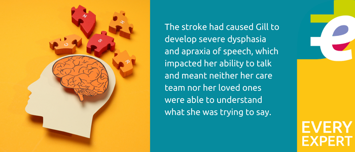 The stroke had caused Gill to develop severe dysphasia and apraxia of speech, which impacted her ability to talk and meant neither her care team nor her loved ones were able to understand what she was trying to say. In some instances, patients can revert to writing things down to make themselves understood, but the stroke had impacted the right side of her body, and being right-handed, Gill wasn’t able to rely on this either.