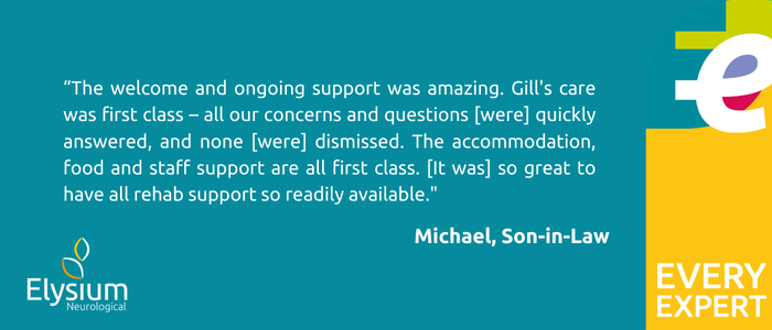 Michael, writing on behalf of Gill, said: “The welcome and ongoing support was amazing. Gill’s care was first class – all our concerns and questions [were] quickly answered, and none [were] dismissed. The accommodation, food and staff support are all first class. [It was] so great to have all rehab support so readily available.”