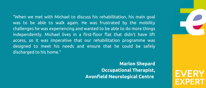 Marlon says: “When we met with Michael to discuss his rehabilitation, his main goal was to be able to walk again. He was frustrated by the mobility challenges he was experiencing and wanted to be able to do more things independently. Michael lives in a first floor flat that didn’t have lift access, so it was imperative that our rehabilitation programme was designed to meet his needs and ensure that he could be safely discharged to his home.”