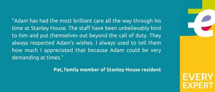 “I’ve always had a great deal of input with Adam’s care, and I used to travel to Stanley House by train regularly, which is more difficult now that my husband John and I are older. Whenever I went, the team at Stanley House accommodated us in every way possible. I used to work as a complaints manager in the NHS, so I know how care should be provided, and I’m very on the ball when it comes to Adam. I always watch carefully when I’m there, and every time I make a suggestion, they act on it immediately.
